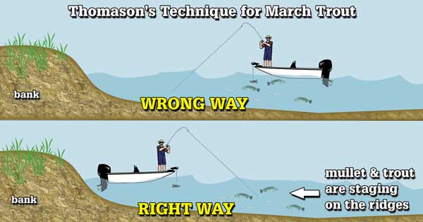 “This is very important to remember at this time of year,” Thomason said. “The bigger trout are feeding on small baitfish right now — mostly minnows and mullet. Mullet becomes their primary source of food in March and April, and that is a key to finding trout.
