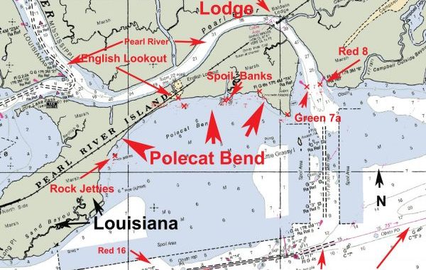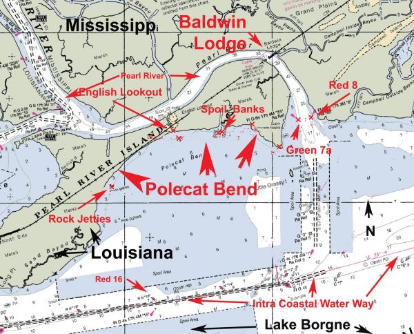 It is the southern area of Pearl River Island. There are numerous locations that draw and hold fish along the “bend.” On a map of the area you will note several of these locations.