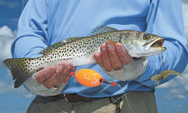 Particularly for trout duties, you can’t go wrong with an artificial shrimp — especially a scented bait like the Berkley Gulp!, DOA or the Mister Twister Exude Shrimp. (DOA offers a prerigged cork-and-shrimp setup called the Deadly Combo.)