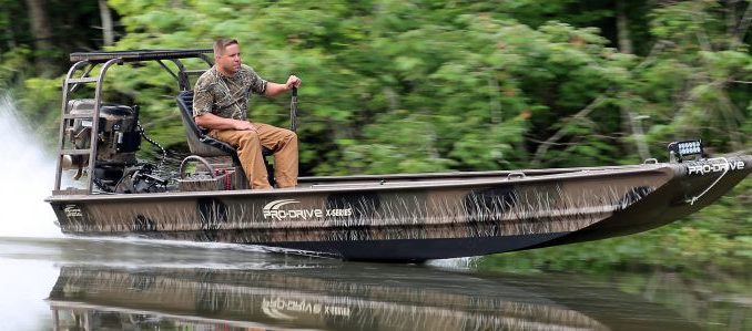 X Series boats are available in 16-, 17-, 18- and 20- foot lengths with 48-, 54- and 60-inch bottom widths. After deciding which length and width fits his or her needs best, the customer selects from a multitude of accessories and layouts to make the boat just right. Many fishermen and duck hunters feel the stick-steering option is the first thing to be considered. It is available with either of Pro-Drive’s 25- or 37-horsepower shallow-draft outboards.