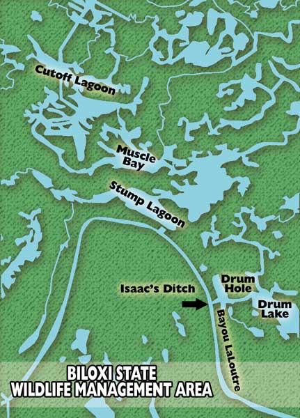 Identical spots are found off Crooked Bayou and Bayous Biloxi, False Mouth and Sue. Aerial photos, even from before Katrina, accurately show most of these thin capillary-like trenasses, which are easy to miss from a boat.