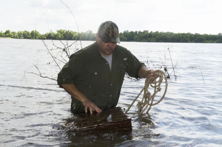 Setting your boxes is easy when the flooded river is maintaining its level, but is made challenging when the water is fluctuating. You need to gauge how fast the river is rising or falling so your box will be at the appropriate depth when you check it two or three days after you plant it. Throughout 70-plus years shrimping, the Folse family has learned that a combination of watermelon rinds, cucumbers and beef bones is the ticket for bait. Folse will generally change the bait each time he checks the boxes depending on their state of decay. Also, if you can find it, cotton seed meal cake is excellent bait and a throwback to the old days of shrimping in this manner. On a banner day with good bait, you can expect 2-3 pounds of shrimp per box.