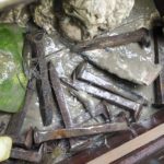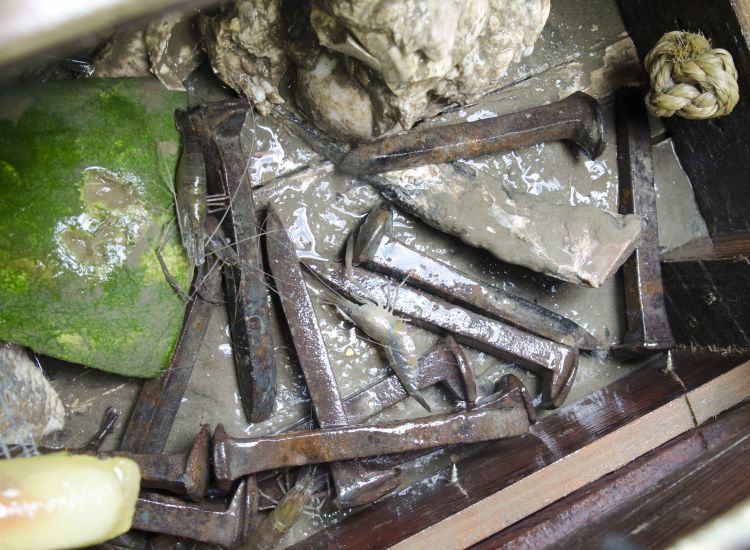 Folse’s boxes are made from cypress, mostly barn doors and slats from old homes. In general, he maintains a “clean” side and a “dirty” side in his boxes. The dirty side houses the bait and is where the shrimp enter through a pair of wire-mesh funnels on the bottom and a single one on the side. They then travel to the “clean” side that has more bait. This is where they are collected. Also in the box are varying amount of weights, from old railroad spikes to iron plates. A well-made cypress box can last up to 30 years. Placement in the river is key to shrimping success.
