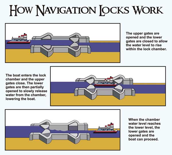 The locks and dams created five pools and a 9-foot-deep and 200-foot-wide channel that stretches from the confluence of the Old and Red rivers to Shreveport-Bossier City. The locks are 84 feet wide, 705 feet long and provide 141 feet of lift.