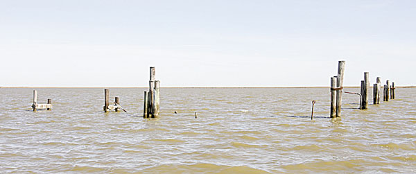 Almost right in the middle of Redfish Bay is an L-shaped line of pilings that used be the mooring spot for a barge that has since broken away and washed against a small island to the north. The pilings above the water are only part of the picture, as this entire area is littered with stuff on the bottom.