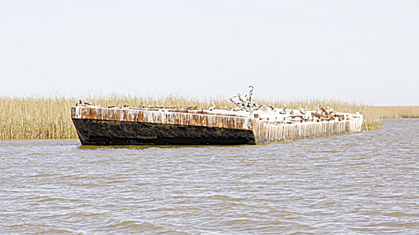 “Redfish love this barge during the spring because the water is two or three degrees warmer around it than out in the bay,” said Langridge. “They don’t really stack up on it, though. Rather, they push along the side of it as they patrol the bank. But they always stick around it just longer than they would just a bank.”