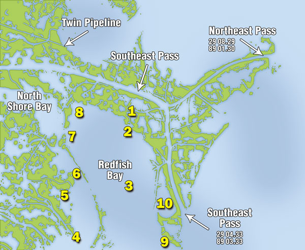 However, Redfish Bay is going to fool some of the anglers all the time and all of the anglers some of the time. Muddy water hides green salt water underneath, and constant current hides the incoming tide rolling in below. You could idle around forever looking for green water to boil to the surface in your prop-wash, or you could just fish these 10 spots.