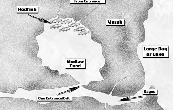 Three, try to find a pond with a ditch, a drain or a trenasse of some kind on the opposite side from the entrance. That’s where the redfish will gang up, Thomason said.