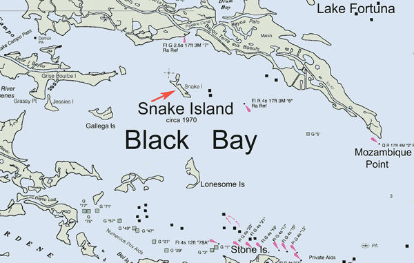 If you wish to get an official NOAA chart of the island and surrounding area, go to a contract NOAA Print on Demand dealer and ask for NOAA chart No. 11364/Mississippi River Venice to New Orleans. Ask for the 40th edition released August 2004. Earlier editions may also show the Snake Island location, but my copy of the 2004 edition does have an island designated as SNAKE ISLAND in the Black Bay area. I believe that the 2004 edition is the latest edition released by NOAA. Almost any official NOAA chart dealer, such as Baker Lyman on Veterans Boulevard in Metairie, should be able to provide you with a copy of the chart.