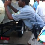 Motoring up to the port, he cut the engine, looking and listening. He heard a weak cry for help over near the moored barges, cranked the outboard and went in that direction.