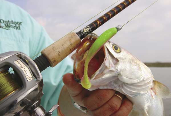 Like figuring out the topwater bite, Waltrip lets the trout tell him how to fish his soft plastic. If he notices that fish are eating it as soon as it hits the water, that’s his clue to keep the bait high in the water and to jerk it back quickly. If the bites are coming on bottom, he slows down and bumps it over the oysters.