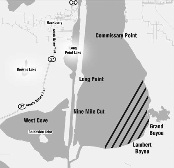 Rue and Waltrip focus mainly on the stretch of Calcasieu from Lambert Bayou in the far southeastern corner of the lake up to Commissary Point. This stretch has several oyster reefs that anglers can see marked on most any of the Calcasieu maps.
