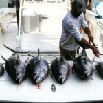 If yoit u’re looking for tuna, you’ll definitely want to find blue water. Set your drift by backing into the current. And always keep a topwater rod set up in case you come upon tunas in open water on your way out, or between rigs. Plan on traveling an average of 25 to 35 miles out of the river to locate rigs holding fish.
