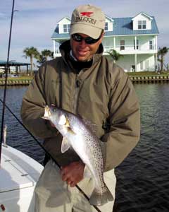 When temperatures hover in the 30s, this area, which is dotted with deep holes, attracts hordes of speckled trout, black drum and redfish.