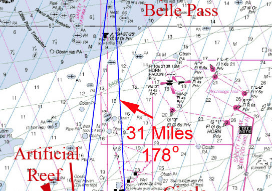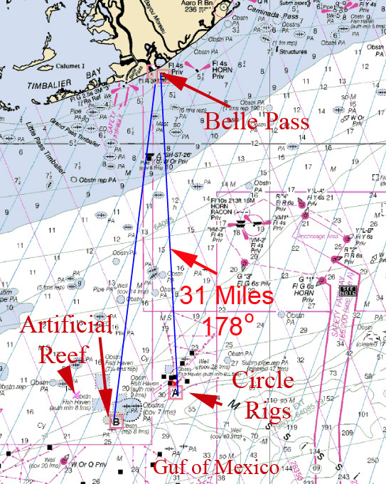 I was wondering the coordinates for the circle rigs out of Belle pass. This is a group of rigs in a circle with numerous artificial reefs made up of old oil rigs and military APC’s. I believe it is approximately 30 miles due south of the pass?