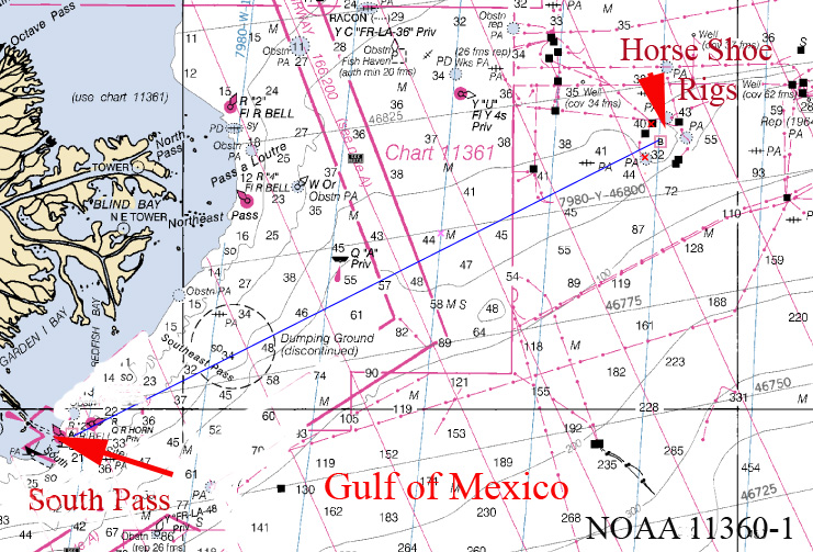 I would get a copy of at least two NOAA Marine charts prior to making the trip. Begin with Chart #11361 – Mississippi River Delta, and then 1115A – Leased Blocks, Cape St. George to the Mississippi River.