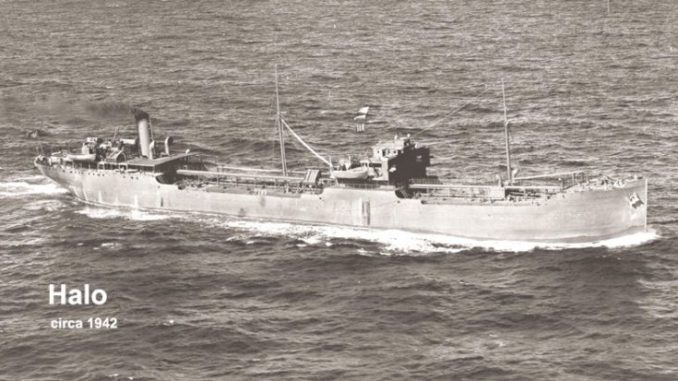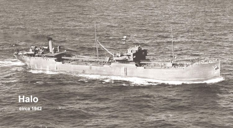 According to the National Oceanic and Atmospheric Administration website, “At 0758 hours on 20 May 1942, the unescorted and unarmed Halo (Master Ulrich Fred Moller) was hit by two torpedoes from U-506 about 50 miles from the Southwest Pass of the Mississippi River, while proceeding on a rapidly changing zigzag pattern at 10.4 knots. The first torpedo struck on the starboard side under the bridge and completely destroyed this part of the ship. The second hit aft of the bridge but forward of the engine room. The second explosion broke the ship in two and ignited the cargo. The tanker plunged bow first, with her propeller still turning, and sank within three minutes; 23 men of the crew of eight officers and 34 men managed to leave the ship, but only one raft was left (because) the four lifeboats and three other rafts were destroyed by the explosions and fire. The survivors huddled together, clinging to wreckage in the water near the sunken ship throughout the night and the next day. The oil on the surface burned for six hours. Two men (clung) to a half-burned raft and stayed on it for seven days without food or water. They were then picked up by Otina and taken to New Orleans.