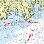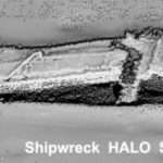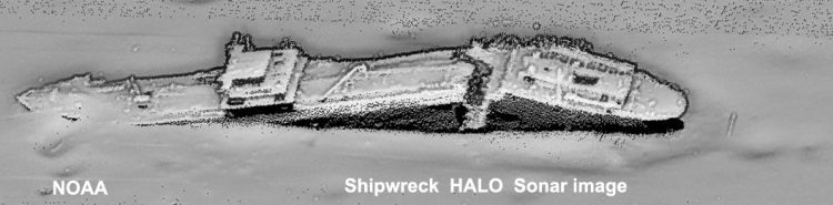“In 2000, a shipwreck tentatively identified as Halo was discovered during a pipeline survey for the oil industry …. From July 30 to Aug. 1, 2004, the Deep Wrecks science team deployed an remotely operated vehicle to investigate the site. The vessel’s bow is embedded deeper in the sea floor than the stern. The forecastle’s upper region stands only 3 meters above the ambient sea floor as opposed to the stern, which has 7.3 meters of relief. Only half of the bow’s windlass can be seen protruding from the sediment. The forward mast still stands, and the top of the mast is approximately 16.5 meters above the ambient sea floor. The vessel’s superstructure and the engine (are) visible through the rear structure. Only portions of Halo’s deck remains were documented because of safety concerns raised by low visibility and potential entanglement. Some brown rusticles, which are formed by microbes, were observed on the structure.”