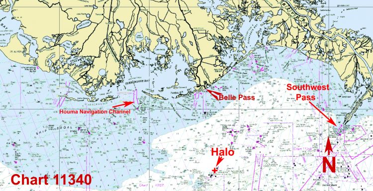 It is located about 35 miles from the beginning of the Houma Navigation Channel at the Gulf at or about a heading of 131 degrees magnetic and about 28 miles from the mouth Bayou Lafourche at Belle Pass at a bearing of 169 degrees magnetic.