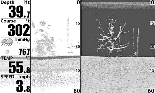 Humminbird’s introduction of Side Imaging for the 2005 product year was the biggest single boost to making screen interpretation easier that I’ve seen in the 35 years I have been using fish finders. Thanks to technology more akin to medical ultrasound than traditional fish finding sonar, Side Imaging scans thin slices of water off both sides of your boat in rapid succession, and generates a screen picture that looks more like a slightly fuzzy photograph than a traditional sonar image. The “photograph” isn’t razor-sharp, but submerged trees look like trees, brush looks like brush, weeds look like weeds and virtually every submerged object is recognizable.