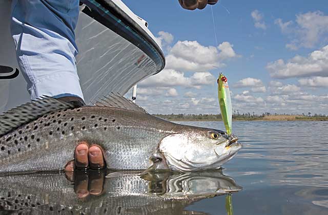 “Also keep in mind that the topwater bite can turn on in any of these areas after a good week or so of warm weather,” Gros said. “We’ve got to get the surface temperature up to get those big trout on the surface. If it happens, you can catch fish on the darker-colored MirrOlure like the Top Dog and She Dog. Save the brighter colors for later in the month or early May.”