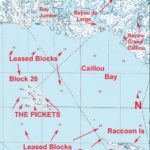 Present and past locations of some of the oil and gas wells/platforms in Leased Blocks 25, 26 and 38 in the southern part of Cailloui Bay are commonly called the Pickets. The well sites are numbered in their respective blocks.
