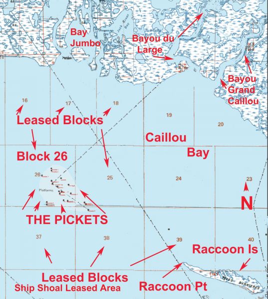 With that in mind, I put together some of the locations where the Pickets are or were located. Although most of the sites are in the Ship Shoal Leased Area Block 26, there are a couple in Leased Block 25 just to the east of Block 26 and one in Leased Block 38 to the southeast of Block 26.