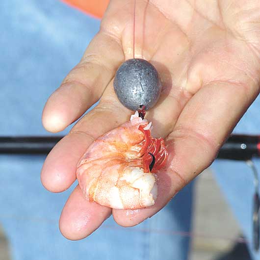 Needless to say, when an estimated 30-pound drum nearly snatched a heavy spinning rod from the hands of a pretty big dude, his buddies quickly joined in the fun. I watched these guys catch and release a trio of 20-plus-pound drum, and they were still going strong when I left. Snapping the heads off of shrimp, they threaded the crustaceans on circle hooks rigged knocker style. (Slip sinker on leader slides, or “knocks,” against the hook.).