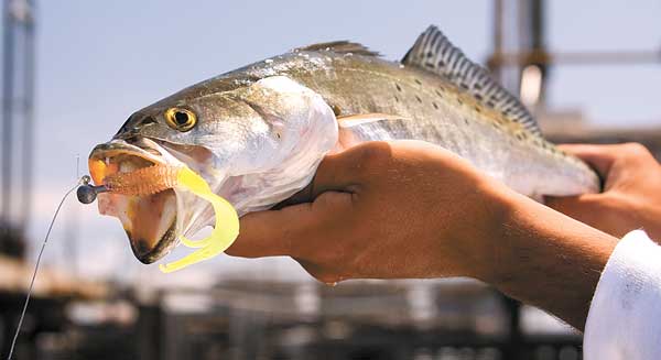 Rojas, a self-admitted student of the old school, says a lot of baits work out there on the rigs, but he most frequently relies on sparkle beetles fished under corks. He’s not averse to throwing new stuff, though, so he sometimes tries Cocahoes and some of the YUM saltwater soft plastics.