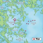 “An incoming tide is best for fishing the north sides of the rigs,” he explained. “The fish stack up on those shells and look back at the rig — they’re waiting on bait to come through the legs of the rig. I like to quickly fish from the northeast corner to the northwest corner by casting up to the rig and working my bait back over the shells.”