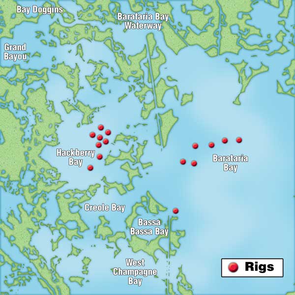 At this point, the Barataria rigs are visible to the east and the Hackberry rigs are visible to the west. Given his druthers, Pike would turn to the west and fish the Hackberry rigs.