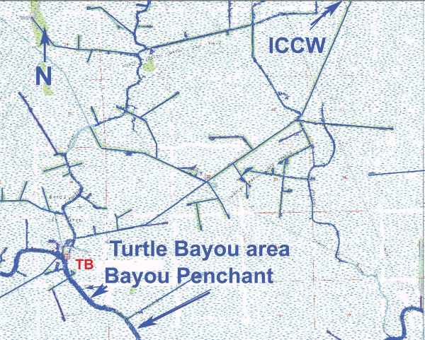 The southern side of the Turtle Bayou area is where Turtle Bayou joins Bayou Penchant at or about 29°31.878’ N. Latitude ~ 91°05.185’.