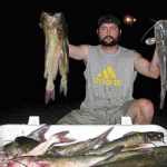 By now it was dark, and almost immediately I noticed Clay fumbling with his rod. Thinking he had hung up, I went back to cutting bait until I heard splashing, and realized he had a nice catfish on. Then his other rod dipped wildly, and Clay had to figure out how to land two cats at one time.