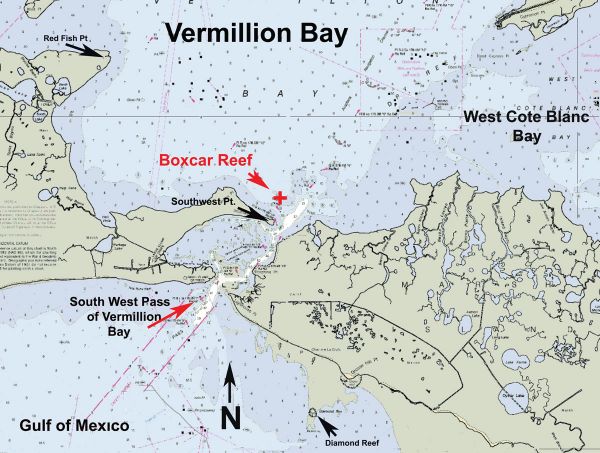 First the easy one. My information is that the Boxcar Reef is in the area of Southwest Point by Southwest Pass of Vermilion Bay.