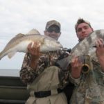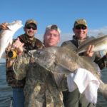 Puppy drum and reds (these rigs are safely within state waters, so the reds go in “da box”) join the sheepshead in these murky waters surrounding these structures in winter.