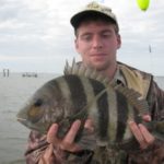 Bull croakers aren’t nearly as plentiful as they were along our coast 30 years ago, but they’re making a comeback around the shallower rigs (and jetties) near the mouth of the river. But what we knew would be stacked up were sheepshead, in their ravenous spawning mode.