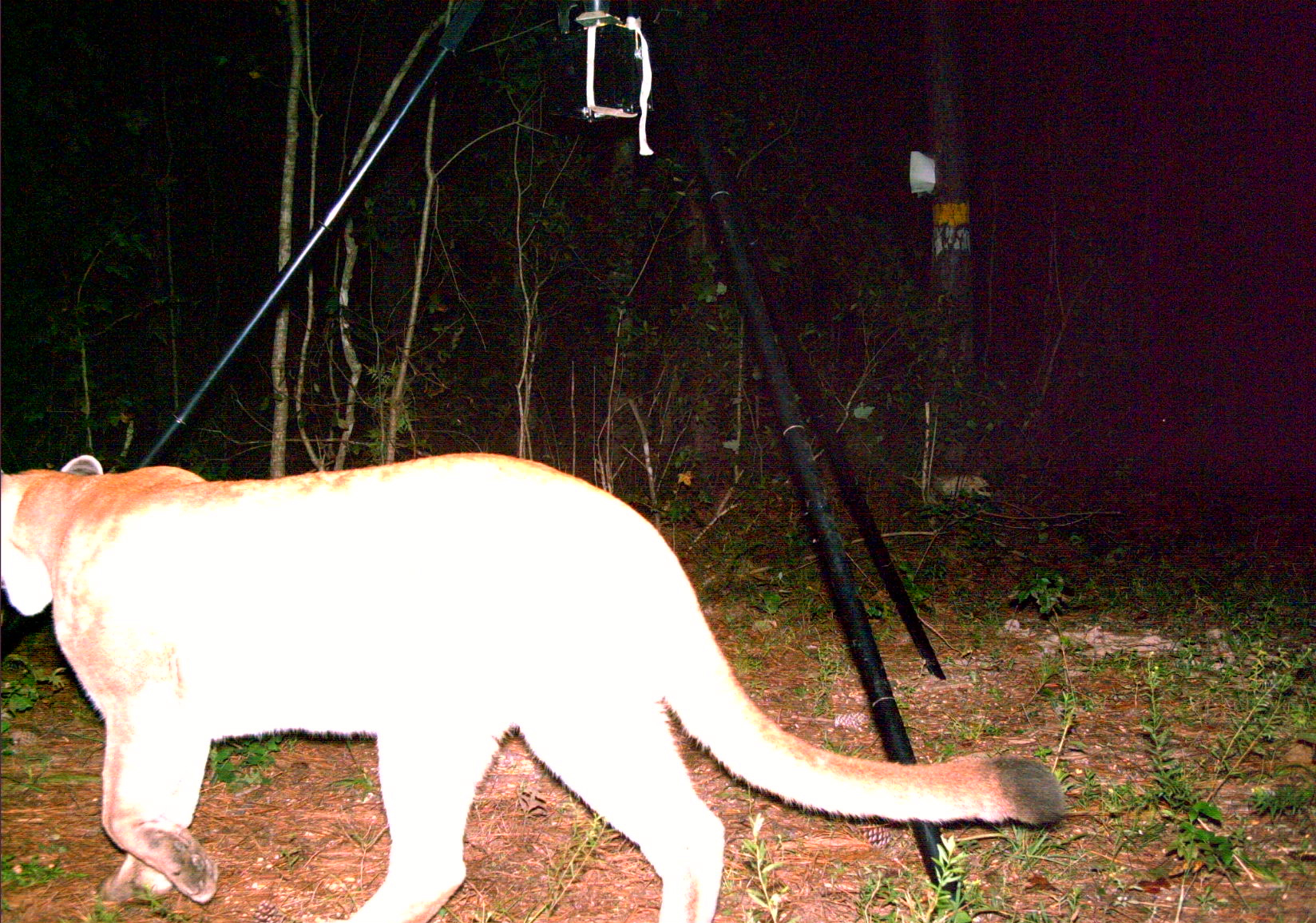 The first photograph was taken in Natchitoches parish on Sept. 4, and the second was taken in Allen parish on Sept. 29. The sites are approximately 100 miles apart, leading to speculation that the same cougar could be in both photos.