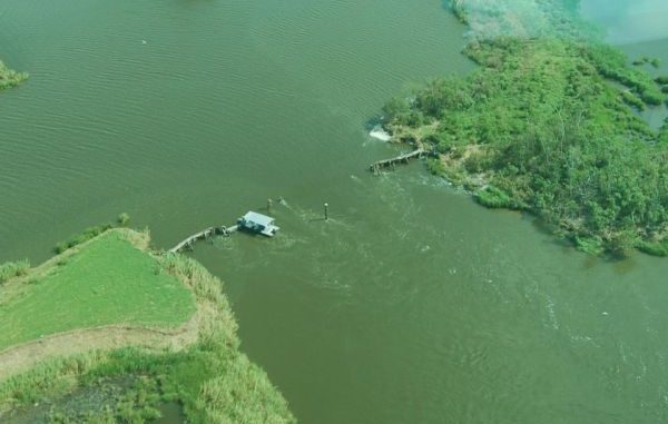 The water control structure, just south of the town of Montegut on the north side of Wonder Lake in Terrebonne Parish, is the first of two water control structures boaters will observe when traveling east from the Humble Canal. The structure was washed out by storm surge from the hurricane. The public is advised that crossing the breach created by the washout is prohibited and fishing near it is hazardous.