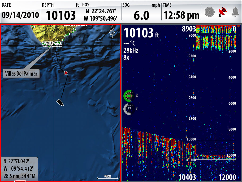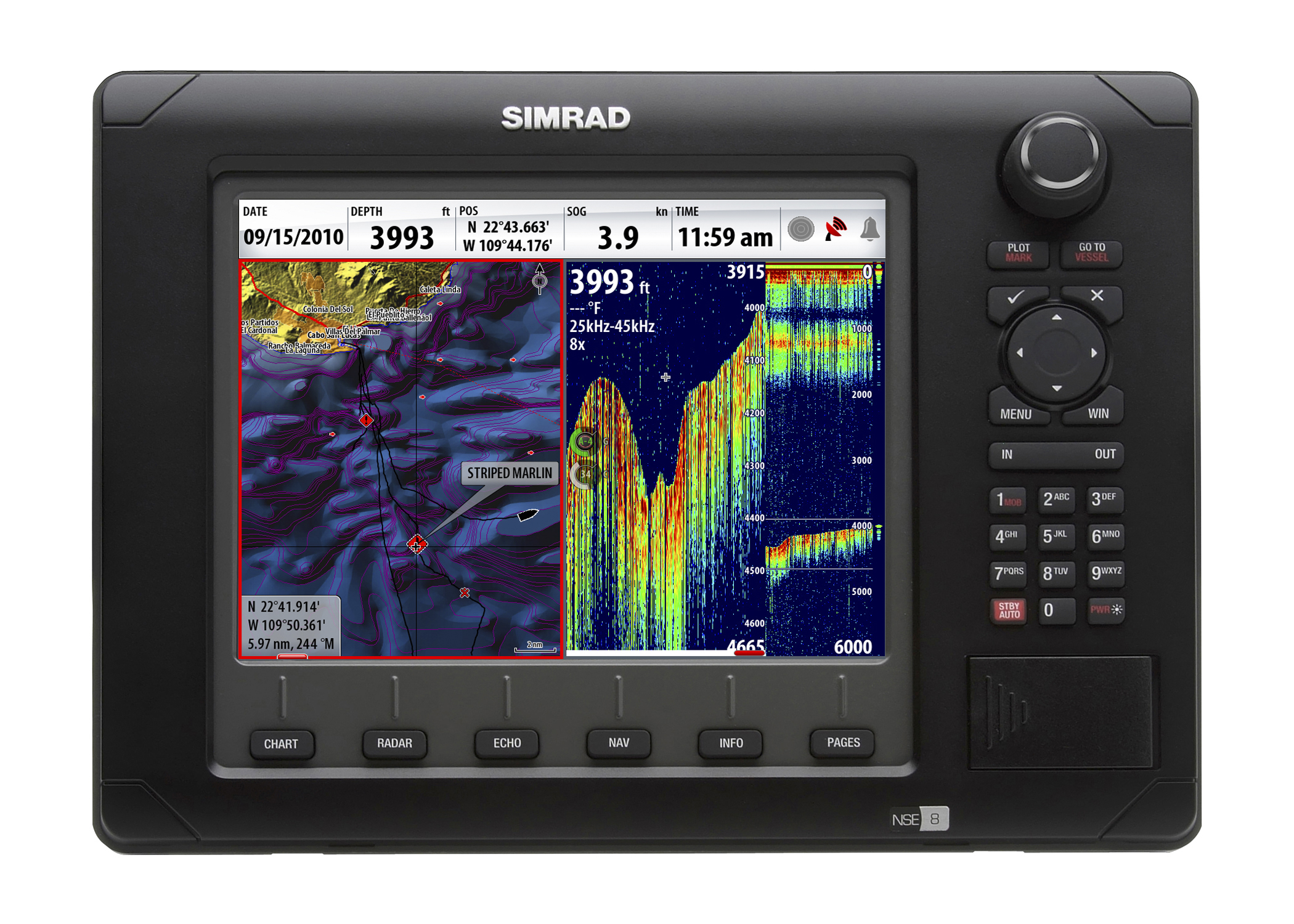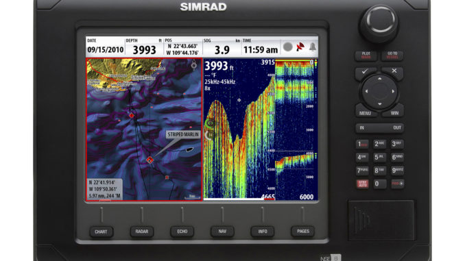 Simrad estimates its BSM-2 CHIRP sonar module delivers as much as five times greater target resolution than comparable echo sounders with offshore performance. The BSM-2 can deliver digital readings at depths greater than 10,000 feet and do it while minimizing or eliminating the usual screen noise from surface clutter, turbulence and other types of interference in the water column. Another considerable benefit is CHIRP’s reported ability to stay locked onto the bottom over deeper water and at higher boat speeds than most conventional sonars could hope to handle.