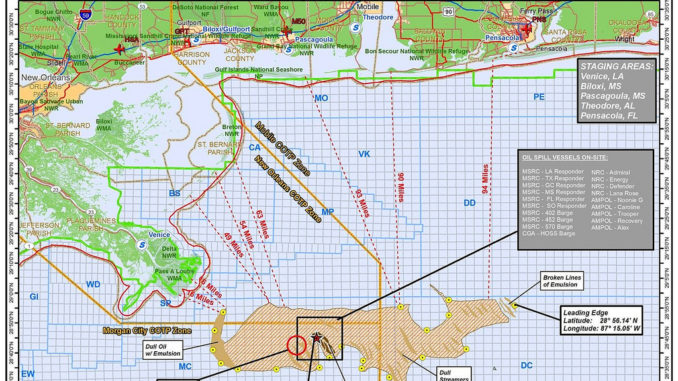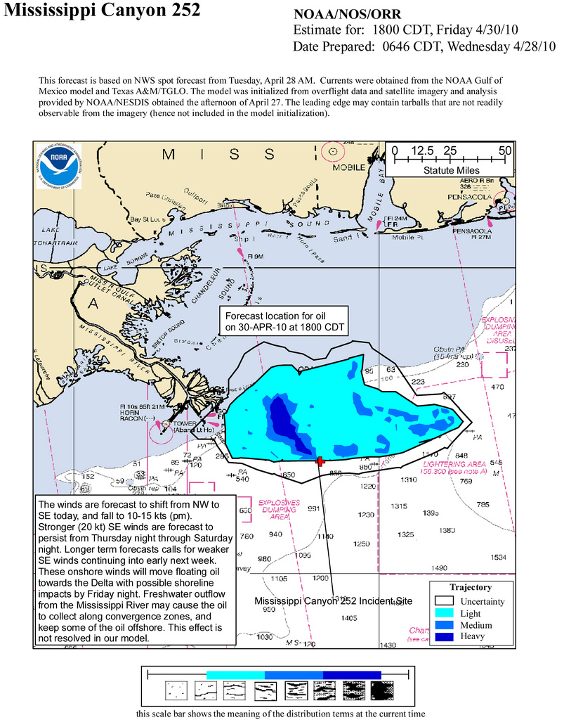 Meanwhile, National Oceanic and Atmospheric Administration officials said the sheen could begin making landfall tomorrow (April 30) at the mouth of the Mississippi River and move into Breton Sound some time Saturday.