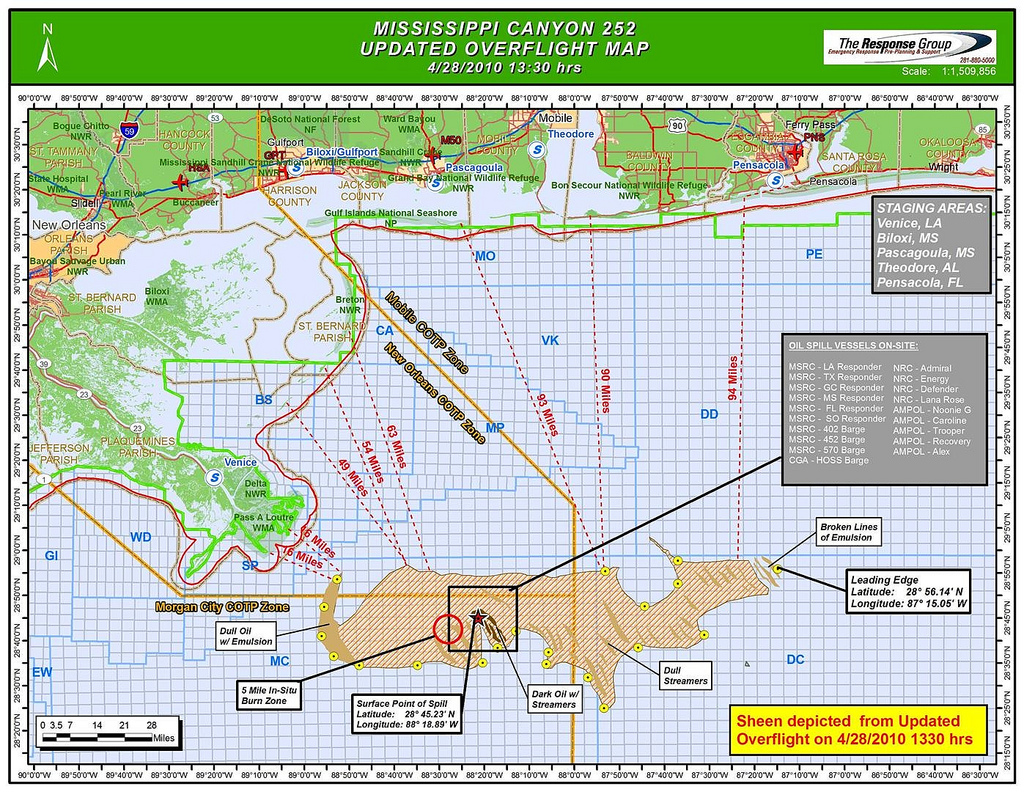 NOAA reported about 1,100 people are battling the spill. As of last night, about 56,000 gallons of oil dispersant, and approximately 260,000 gallons of oily water had been collected. Nearly 50 vessels—including 16 skimming boats, four storage barges, 11 support vessels—and multiple aircraft are conducting containment and cleanup operations in the area.