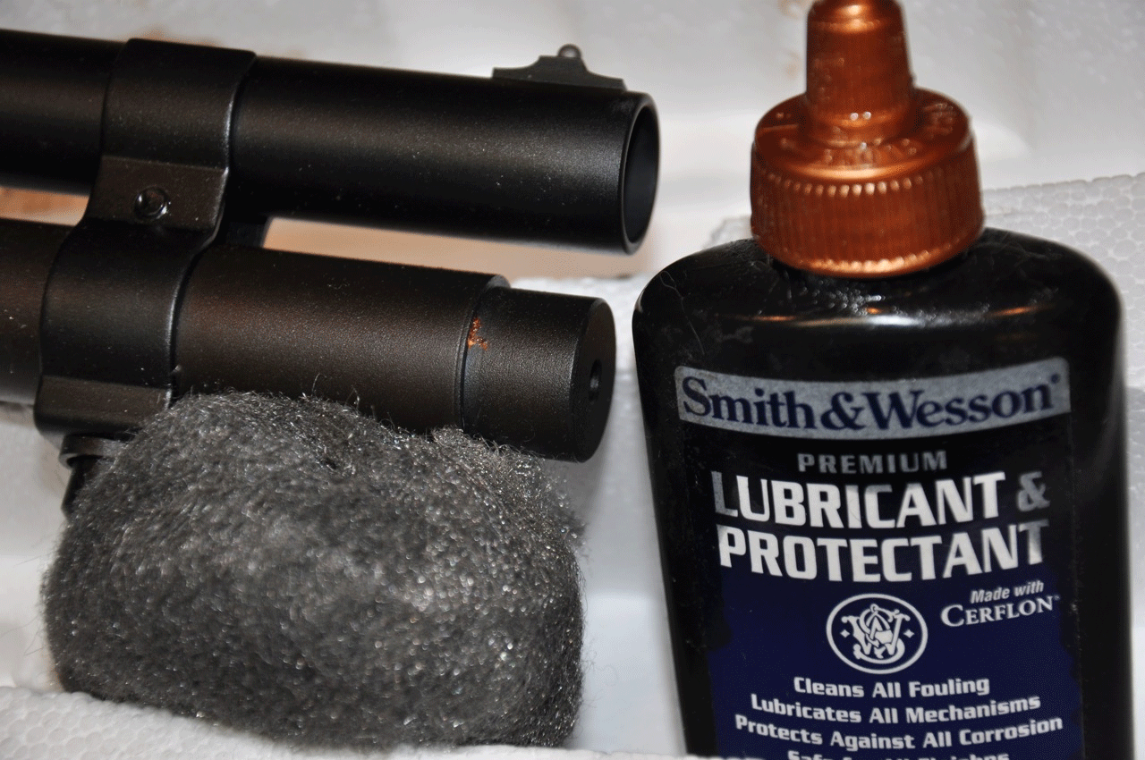 An excellent start to cleaning any firearm is to spray it down with a cleanser that removes oils, grease, burned powders, etc. When I was in the Army, I used to clean my rifle barrel and all its parts first with cigarette lighter fluid. Once the fluid washed the steel clean, it evaporated, leaving a clean, unprotected surface. I would then wipe everything down with an oily rag, and run a lightly oiled patch through the bore.