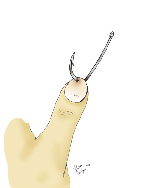 What I didn’t notice was that an old fishing line with a bream hook had somehow become tangled in the motor. When I pulled the cord, my right thumb snagged the hook. The fishing line broke, but not before the hook drove into the quick, and the barbed point lodged deep under the nail.