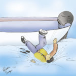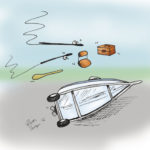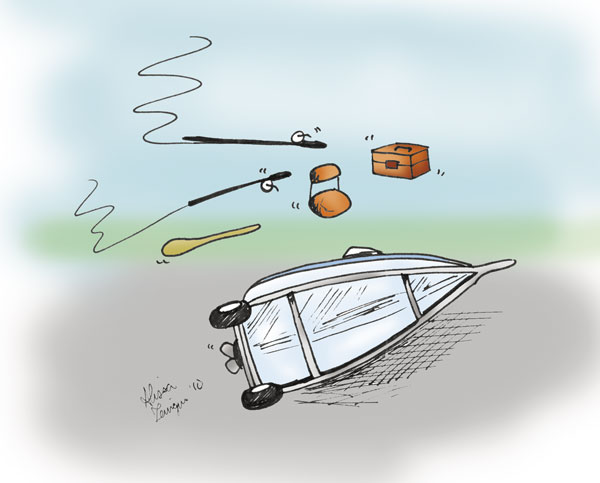When I cut sharply to the right to enter the road, the boat trailer jumped the curb. The combination of speed and sharp turn caused the boat and trailer to tip over right in the middle of the street. Rods, gas tank, tackle box, boat seats, paddle — everything went flying across four lanes of traffic. I screeched to a halt and rushed back to check on things, more worried about the motor (i.e., the replacement for the one that had fallen off my boat earlier) than anything else.