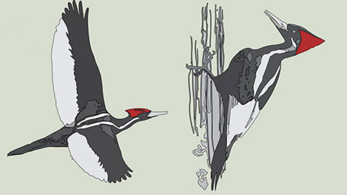 The IBWO is about the size of a crow with a long ivory-colored bill. The birds have a black body with white feathers on their cheeks that wind around to the back, and the males have a red crest. White feathers are on the wings’ top trailing edges and on the front and trailing edges underneath. Pileated woodpeckers are sometimes misidentified as IBWOs because they share some of the same markings, but they are, in fact, a separate species.