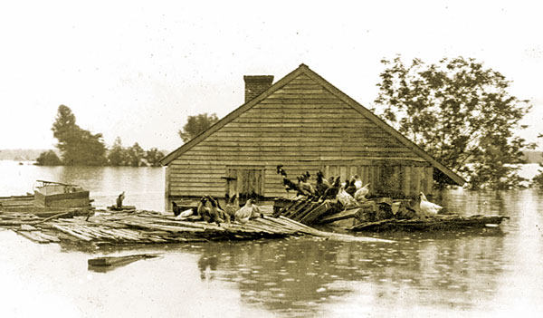 “I have seen snakes, raccoons, mink and rats all on the same log each holding on for dear life and past enmities entirely forgotten. … On top of one floating hen house, the sight that met our eyes was two big rabbits and a half dozen full-grown rats. They were brothers in distress, and it seemed they knew it.