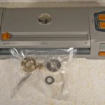 One roll of bag material stores under the G500’s lid in a special compartment. To make your own bags, just unroll enough material to reach the heat sealing strip. With the part of the bag you want to seal against the sealing strip, close and latch the lid. Press the “Seal” button to seal it. When the red progress light turns off, unlatch the lid. Unroll about 3 more inches of material than you need for the current storage job, and then close the lid. Slide the lid’s built-in cutter across the material to cut it cleanly. Don’t make the bag too short: you need at least 3 inches of space between the top of the contents and the seal.