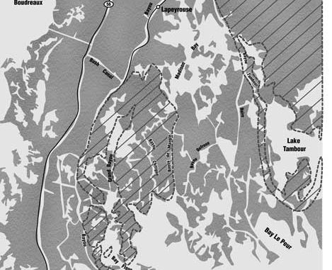 The second area is even larger, covering the marsh from Lake Tambour to Wonder Lake between Bayou Tambour and Bayou St. Jean Charles.