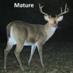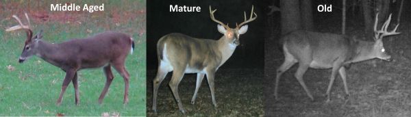 Mature Bucks — 5 ½ to 6 ½ years old. Five-and-a-half-year-olds exhibit large, heavy antlers, as they are at or approaching 100 percent of their ultimate potential. They usually display obvious stomach sag, a slight drop in the back and their necks have an almost unnatural inflated look, eliminating the junction where the chest meets the neck. They have thick legs, and are in overall peak muscular condition, showing little evidence of aging.