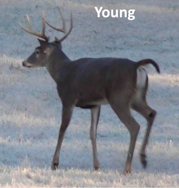 Young Bucks — 1 ½ to 2 ½ years old. A yearling buck is often described as looking like a doe with antlers. They have long, thin legs, and their necks do not swell during the rut.